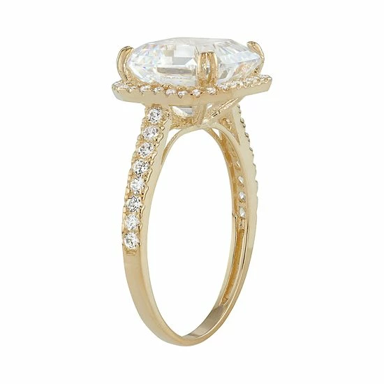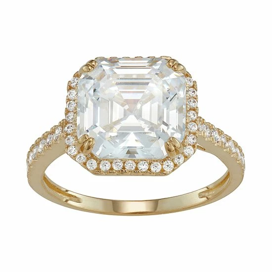 Adorned with an Asscher-cut CZ center stone and dazzling CZ accents, this 10k gold halo ring offers eye-catching style.