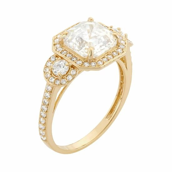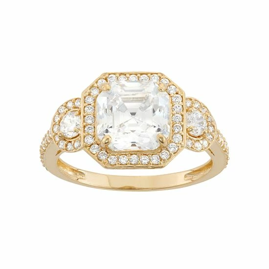 Adorned with an asscher-cut cubic zirconia center stone surrounded by illuminating cubic zirconia accents in a halo motif, this 10k gold engagement ring is a stunning way to profess your love.