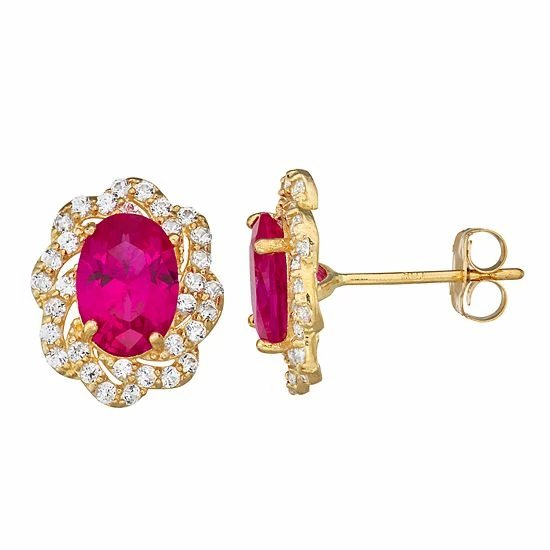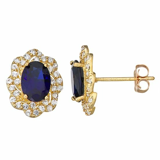 Featuring oval-shaped stones accented with a halo motif, these 10k gold studs offer a touch of classic elegance.