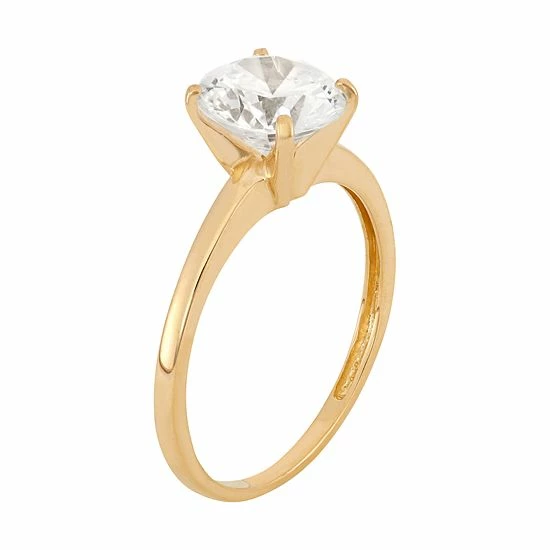 A round-cut cubic zirconia solitaire makes this 14k gold ring glisten with beauty.