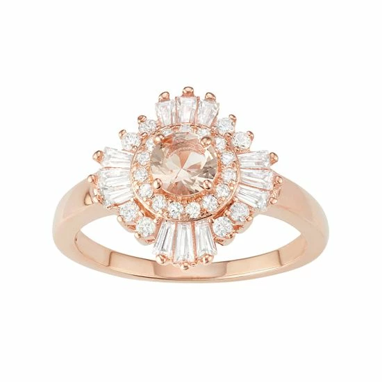 Decorated with a simulated morganite center stone and cubic zirconia accents, this halo ring abounds with eye-catching elegance.