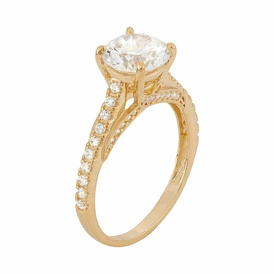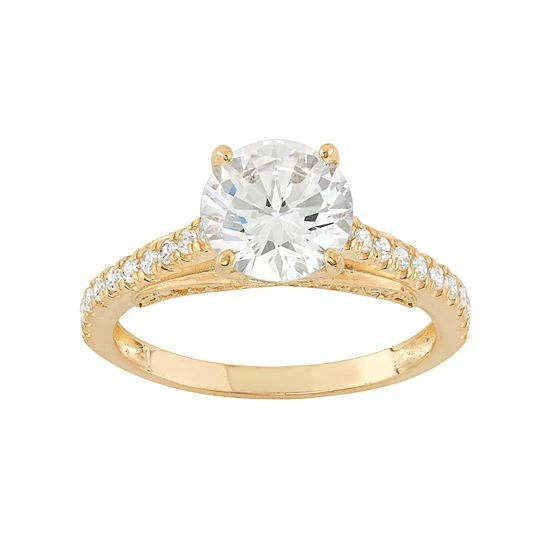 Show her how much you care with this 10k gold engagement ring. A round-cut cubic zirconia center stone sparkles at every angle, while cubic zirconia stones adorning the band and gallery add extra scintillation.
