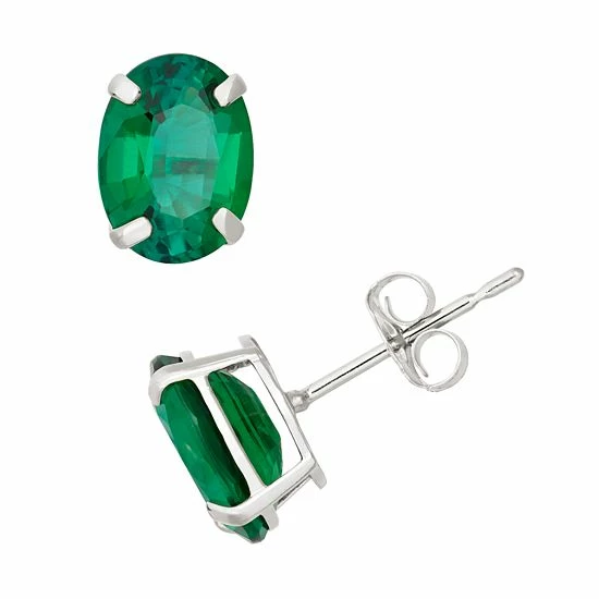 Sparkling oval-cut lab-created emerald stones make these 10k white gold stud earrings a dazzling choice.