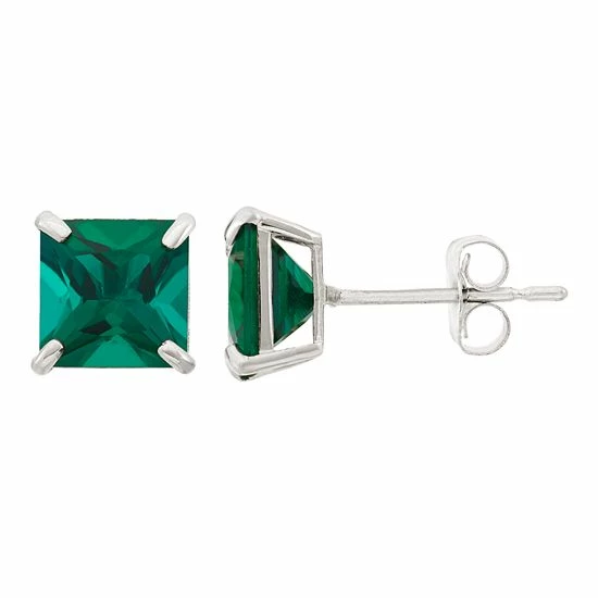 Princess-cut, lab-created emerald stones give these 10k white gold earrings dazzling beauty.