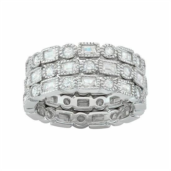 With alternating round- and baguette-cut cubic zirconia stones, this stackable eternity ring set offers elegant appeal.