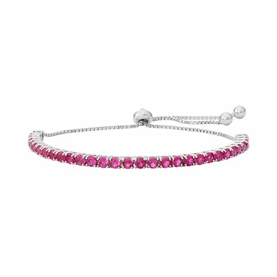 Adorned with round-cut, lab-created ruby stones, this adjustable lariat bracelet abounds with elegant beauty.