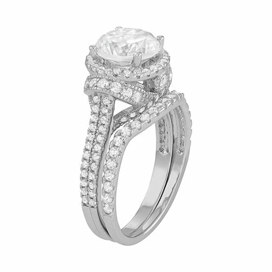 Exemplify your love with the breathtaking beauty of this engagement ring set. Covered in round-cut, lab-created white sapphires, this halo engagement ring set stuns from every direction.