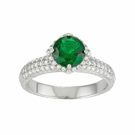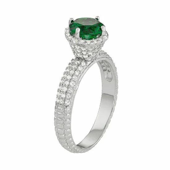 A round-cut simulated emerald center stone serves as the focal point on this captivating halo ring, while lab-created white sapphire accents add brilliant sparkle.