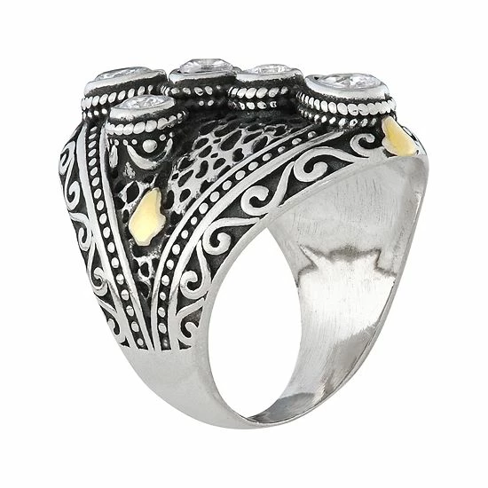 Designed with faceted stones and filigree accents, this two-tone sterling silver cross ring is a testament to your faith.