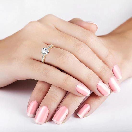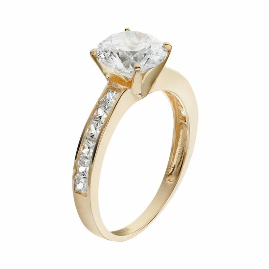 Elevate your look with this beautiful 10k gold ring. A round-cut cubic zirconia center stone sparkles at every angle, while cubic-zirconia stones adorning the band add the perfect finishing touch.
