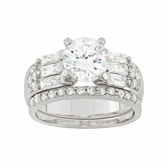 Take her breath away when you present her with this enchanted engagement ring set. Decorated with a prominent round-cut cubic zirconia stone encompassed by baguette- and round-cut cubic zirconia accents, this engagement ring set is simply gorgeous.